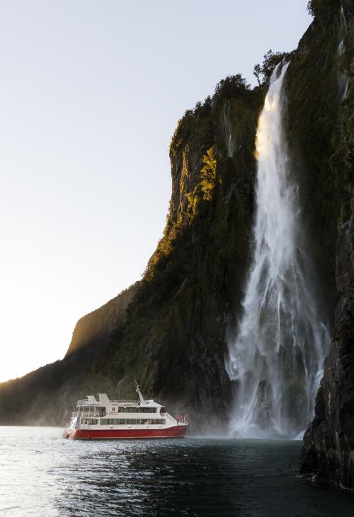 Milford Sound Nature Cruise getting close to the Stirling Falls waterfall